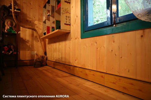 В этом случае тепло передается в помещение с помощью невысокого плинтусного обогревателя, который имеет совсем небольшую высоту (порядка 10 см) и располагается по всему периметру помещения.